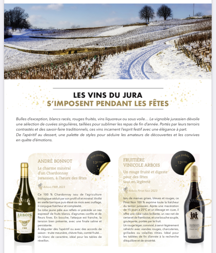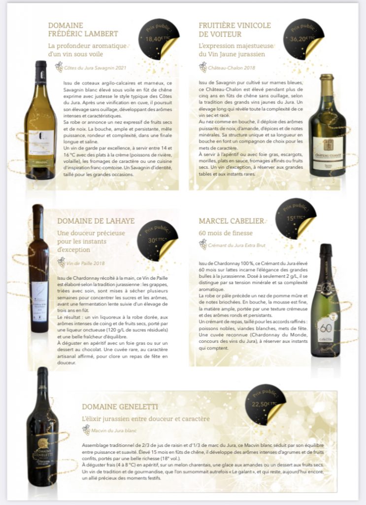 Bulles d’exception, blancs racés, rouges fruités, liquoreux ou sous voile… Les vins du Jura dévoilent une sélection de cuvées uniques, prêtes à illuminer vos tables de fête. Entre fraîcheur minérale, intensité aromatique et savoir-faire ancestral, chaque bouteille raconte un terroir et promet un moment d’exception.
