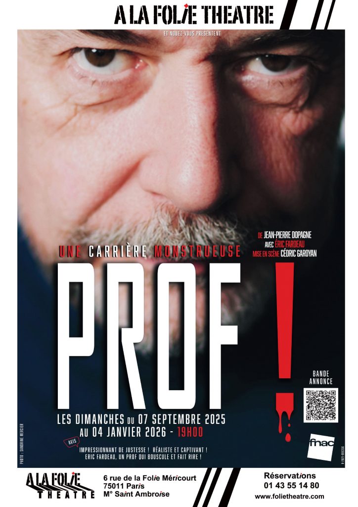 À partir du 07 septembre, Prof ! Une pièce de théâtre de Jean Pierre Dopagne, jouée par le comédien Eric Fardeau sur une mise en scène de Cedric Garoyan A La Folie Théâtre (Paris 11).