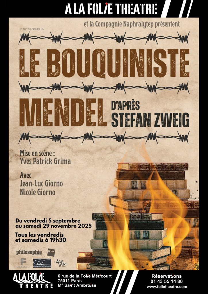 Le bouquiniste Mendel de Stephan Zweig, jouée et adaptée par le comédien Jean-Luc Giorno sur une mise en scène de Yves Patrick Grima A La Folie Théâtre (Paris 11) du 05 septembre au 29 novembre 2025.