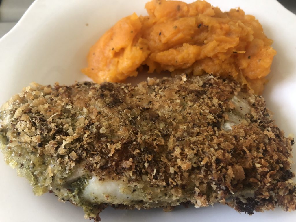 Trempez le lieu dans le pesto, puis dans un œuf battu salé et poivré, puis dans la chapelure agrémentée d’épices Italiennes & pecorino.