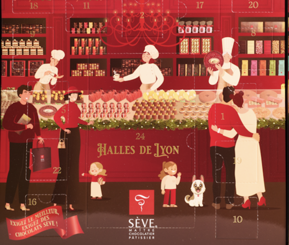 Le design du calendrier s’inspire de l’univers chaleureux de la boutique Sève des Halles : l’abondance des étals, l’effervescence des allées… et, trônant au-dessus de l’entrée, le célèbre lustre rouge, visible de loin, devenu une signature visuelle de la boutique.