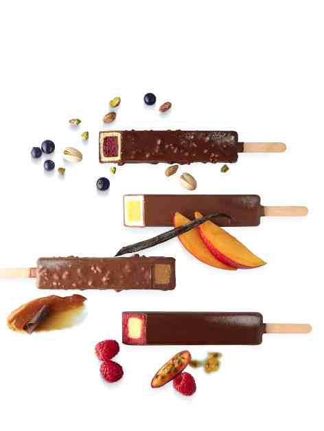 Le Maître Chocolatier Nicolas Cloiseau et le MOF Glacier David Wesmaël* repensent les plaisirs givrés de l’été. En enrobage ultra fin, la coque de chocolat se brise et retient son plongeon glacé dansune intensité noire ou lait. Noisettes-Caramel À fleur…
