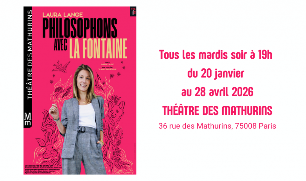 Une création singulière où la philosophie rencontre l’esprit affûté de Jean de La Fontaine. Entre conférence vivante, théâtre et respiration musicale, Laura Lange revisite les fables pour en extraire une philosophie joyeuse, accessible et résolument contemporaine.