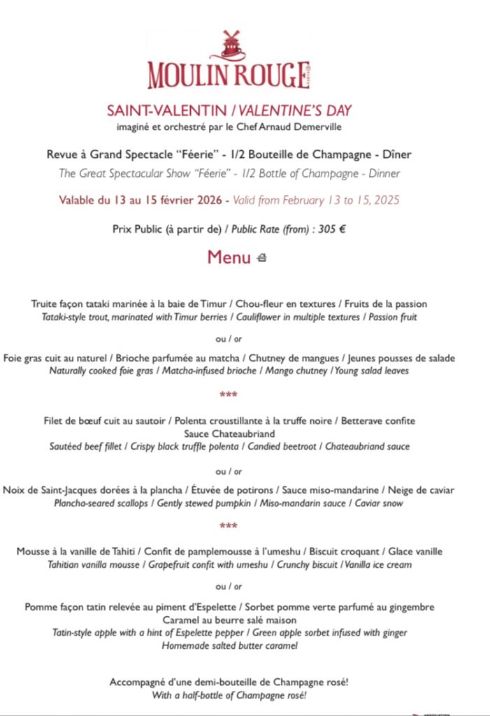 À cette occasion, le Chef Arnaud Demerville, Maître Cuisinier de France, a imaginé un menu unique alliant produits de saison et ingrédients d’exception, pour sublimer ce moment à deux. Distingué par le titre de “Maître Restaurateur” depuis 2018, le Moulin Rouge place la création et la qualité au cœur de son expérience gastronomique.
